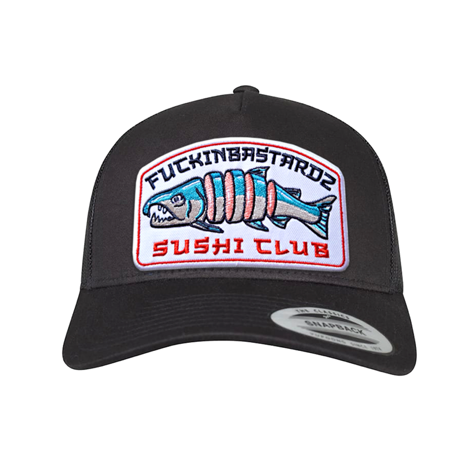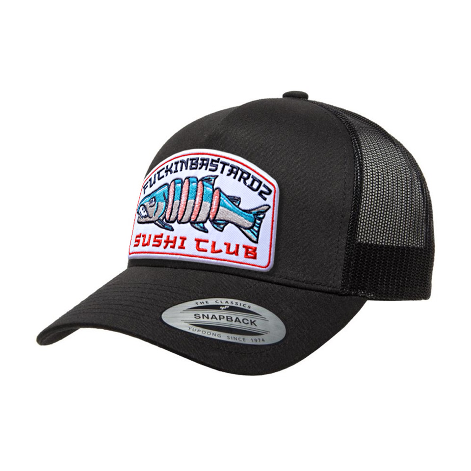 Gorra trucker de la marca FBInc en color negro con un parche con fondo blanco con un Salmón troceado y el nombre de la marca "FuckinBastardz". La parte trasera es toda de red para mejor transpiración y tiene una banda de plástico para poder regularla al tamaño deseado con broche.