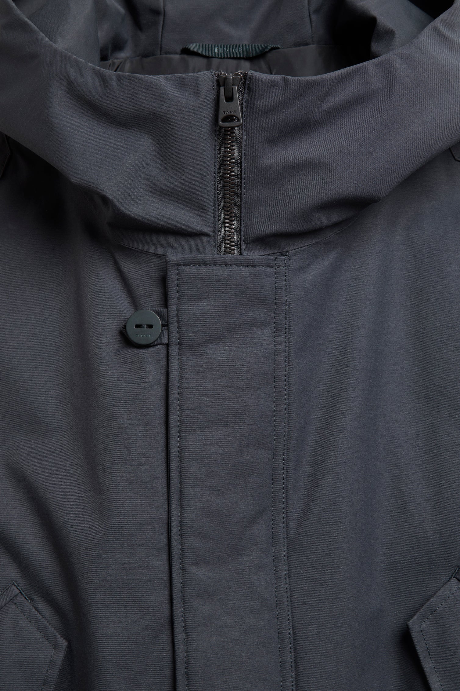 Confeccionada con tejido resistente al agua; debido a su confección, la prenda no es totalmente impermeable. Costuras resistentes en capucha, hombros y sisas selladas con cinta impermeable.