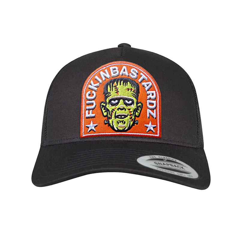 Gorra trucker de la marca FBInc en color negro con un parche naranja con la cabeza de "Frankenstein" en verde y el nombre de la marca "FuckinBastardz". La parte trasera es toda de red para mejor transpiración y tiene una banda de plástico para poder regularla al tamaño deseado con broche.