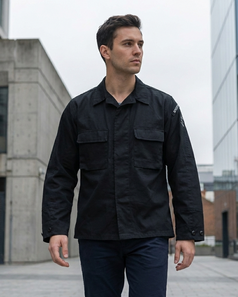 Esta camisa negra de twill altamente resistente está fabricada en algodón-nylon, su talla es M europea. Las motos y la ropa militar han ido siempre de la mano.