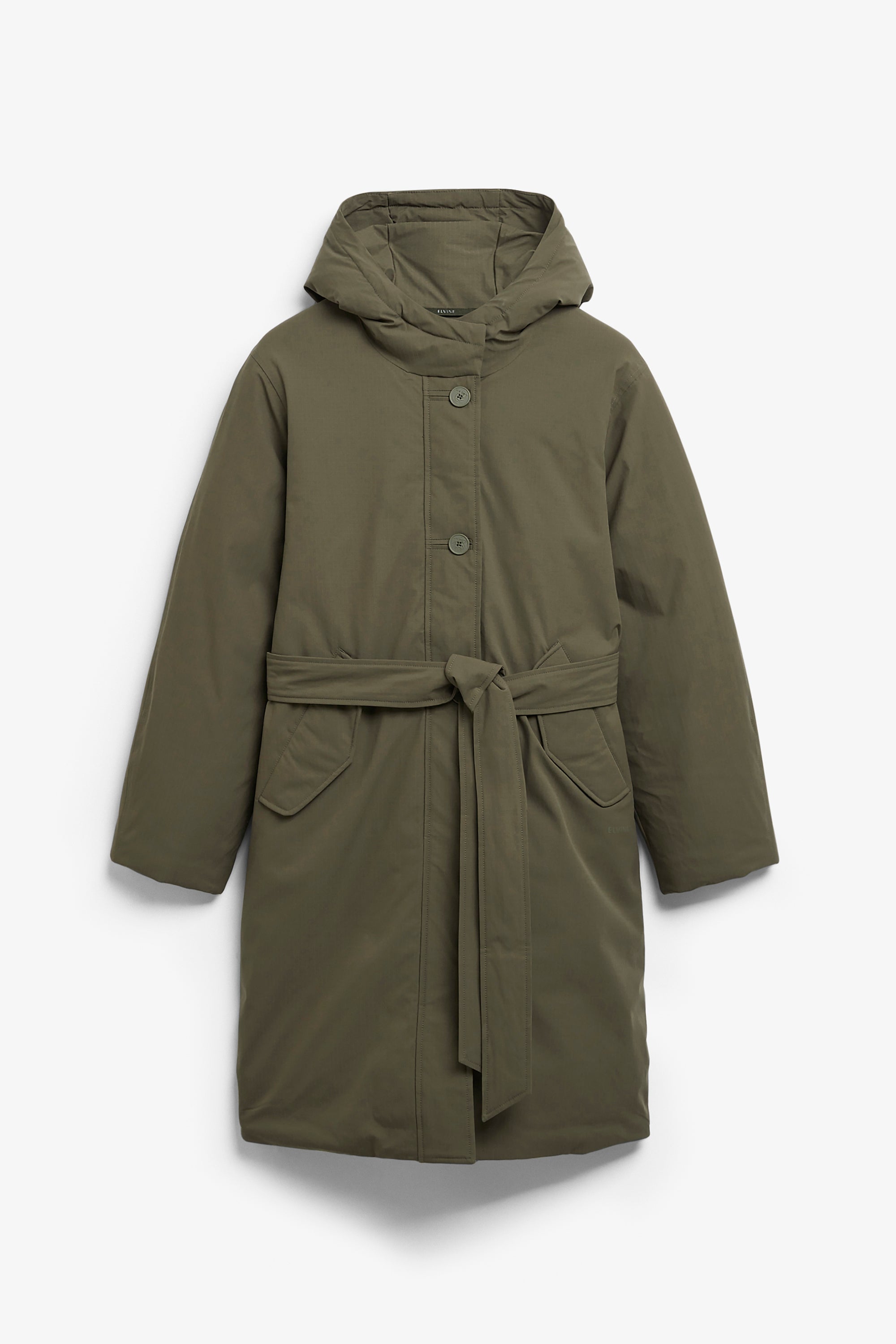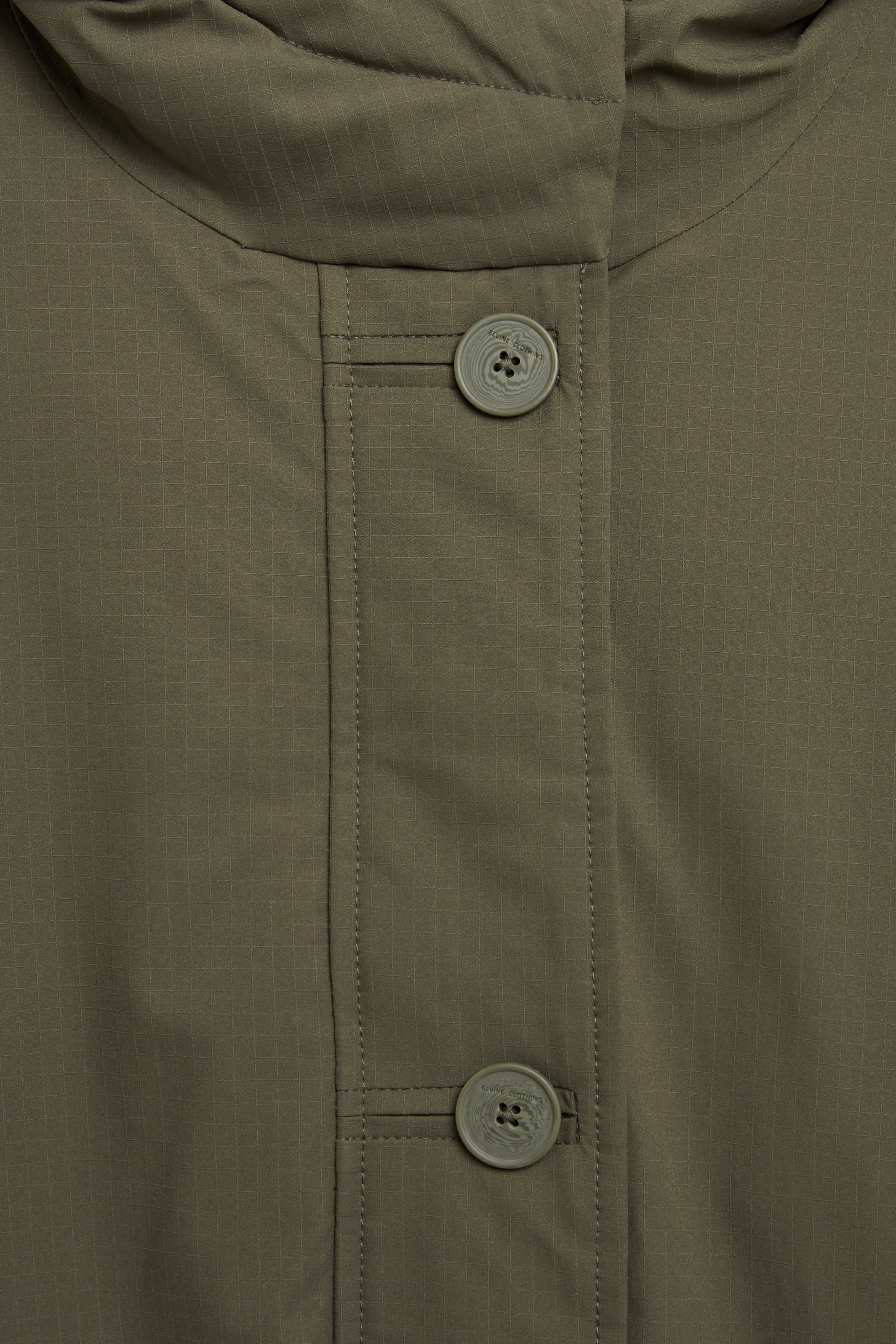 Confeccionada con tejido resistente al agua; debido a su confección, la prenda no es totalmente impermeable.