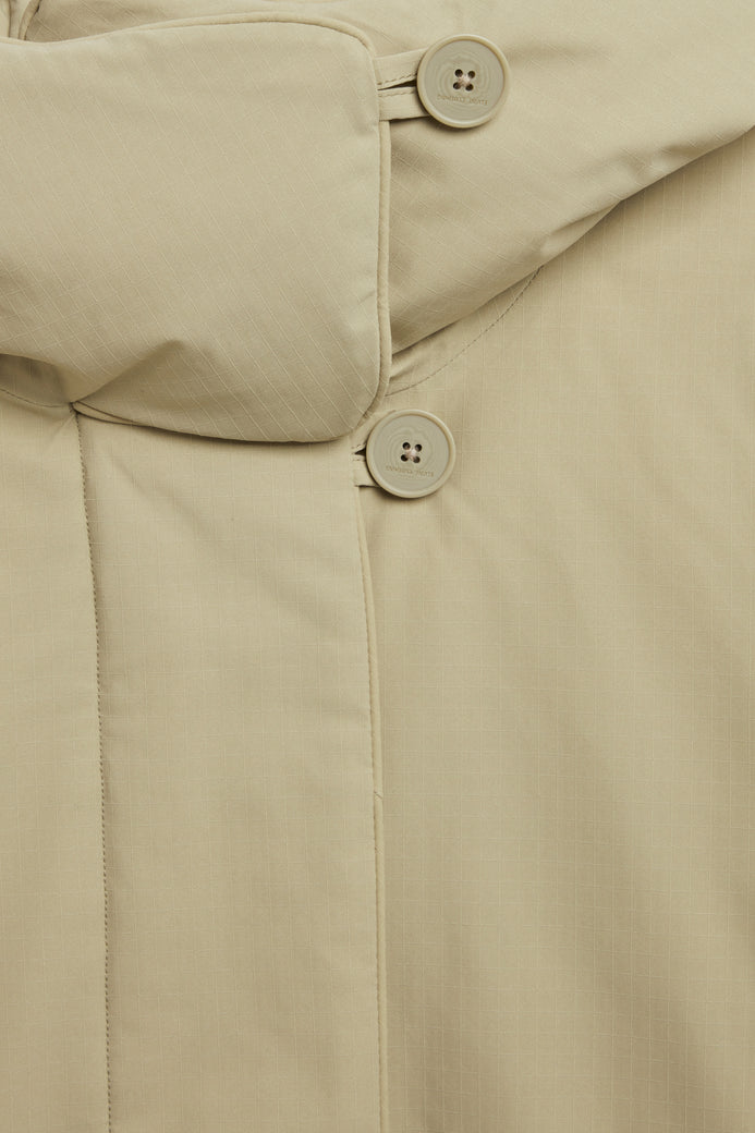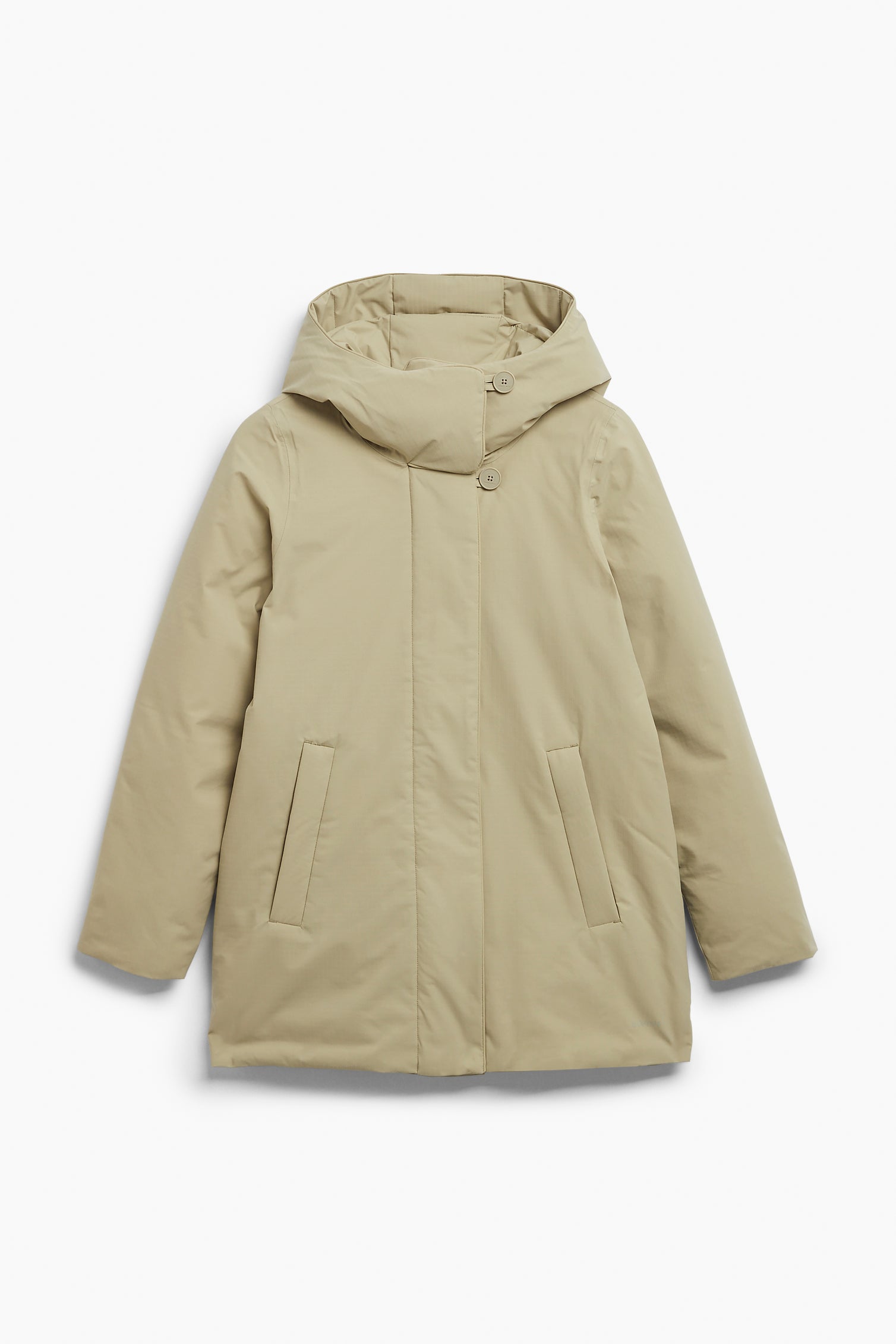 Confeccionada con tejido resistente al agua; debido a su confección, la prenda no es totalmente impermeable.