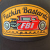 Gorra trucker de la marca FBInc en color negro con un parche amarillo que incluye un coche "hot rod" customizado de color rojo con las siglas de la marca. La parte trasera es toda de red para mejor transpiración y tiene una banda de plástico para poder regularla al tamaño deseado con broche.