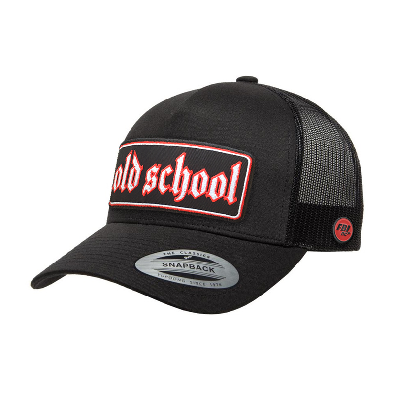 Gorra trucker de la marca FBInc en color negro con un parche que dice "Old School " en colores blanco y rojo. La parte trasera es toda de red para mejor transpiración y tiene una banda de plástico para poder regularla al tamaño deseado con broche.