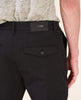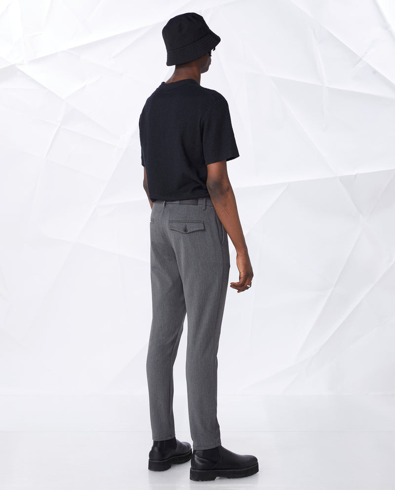 • Cierre de botón en la parte delantera, bragueta con cremallera YKK, bolsillos laterales en la parte delantera, dos bolsillos traseros viveados (uno con solapa), etiqueta con logo en la cintura