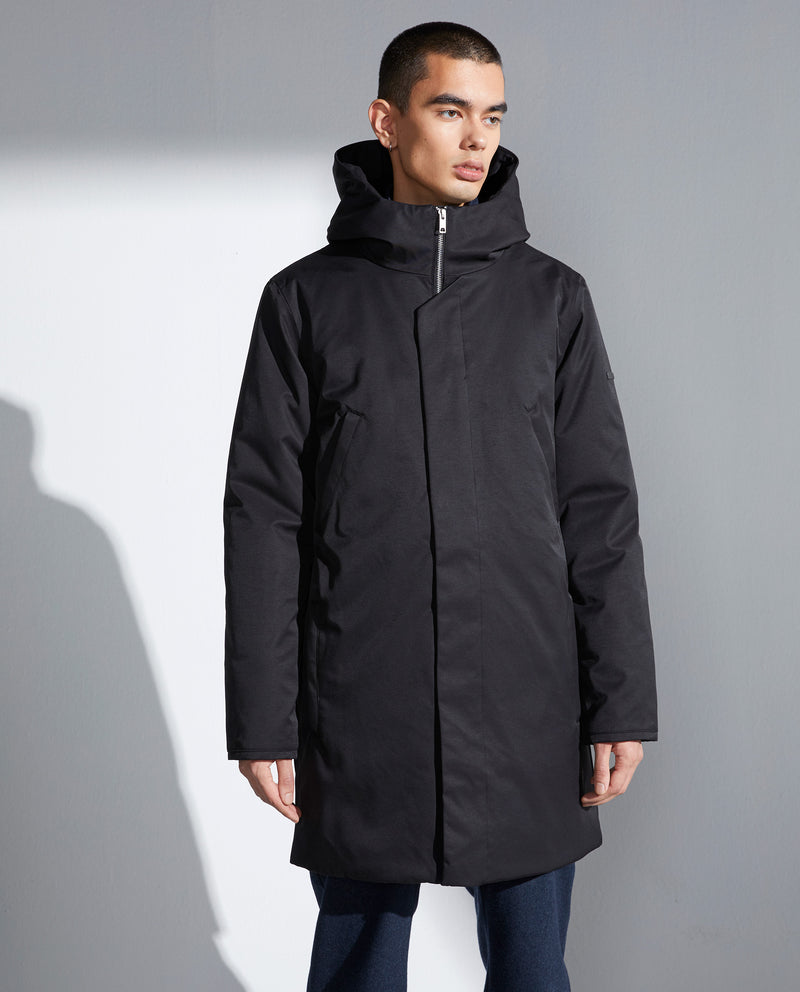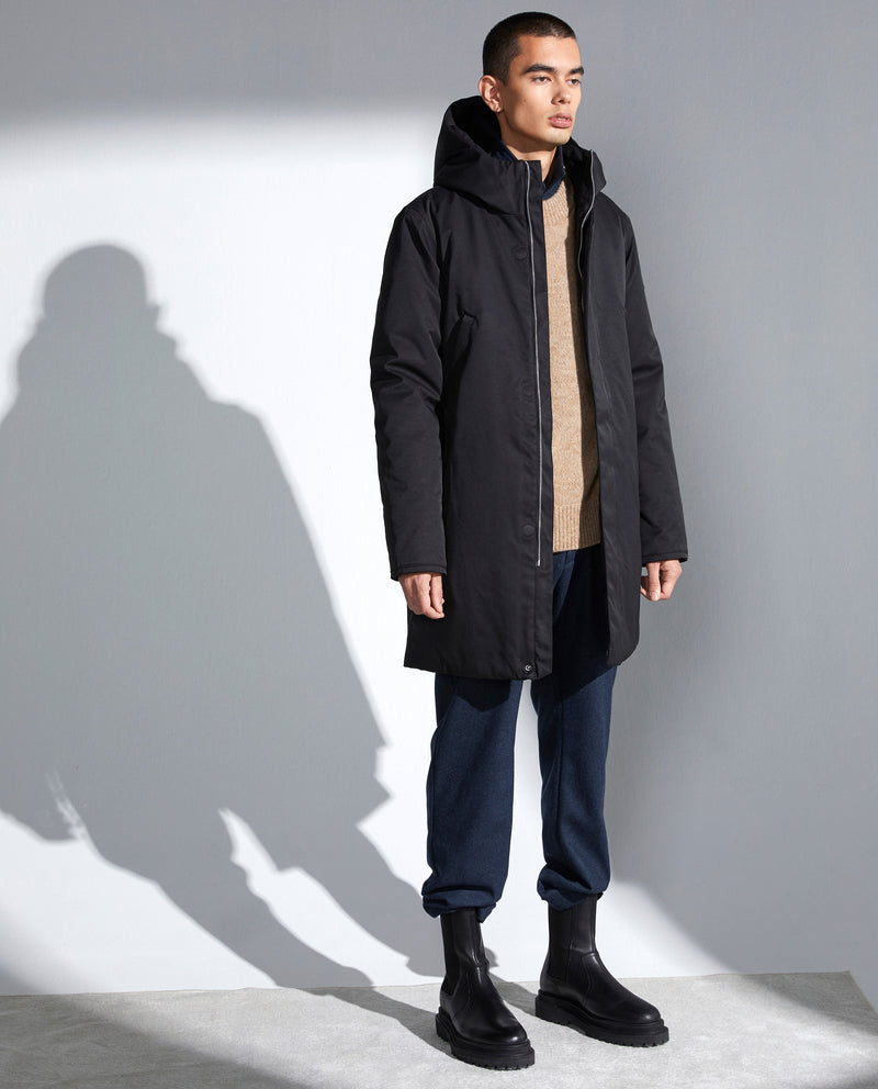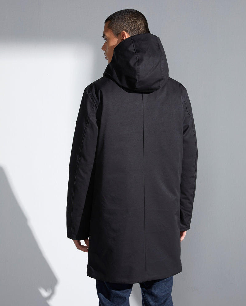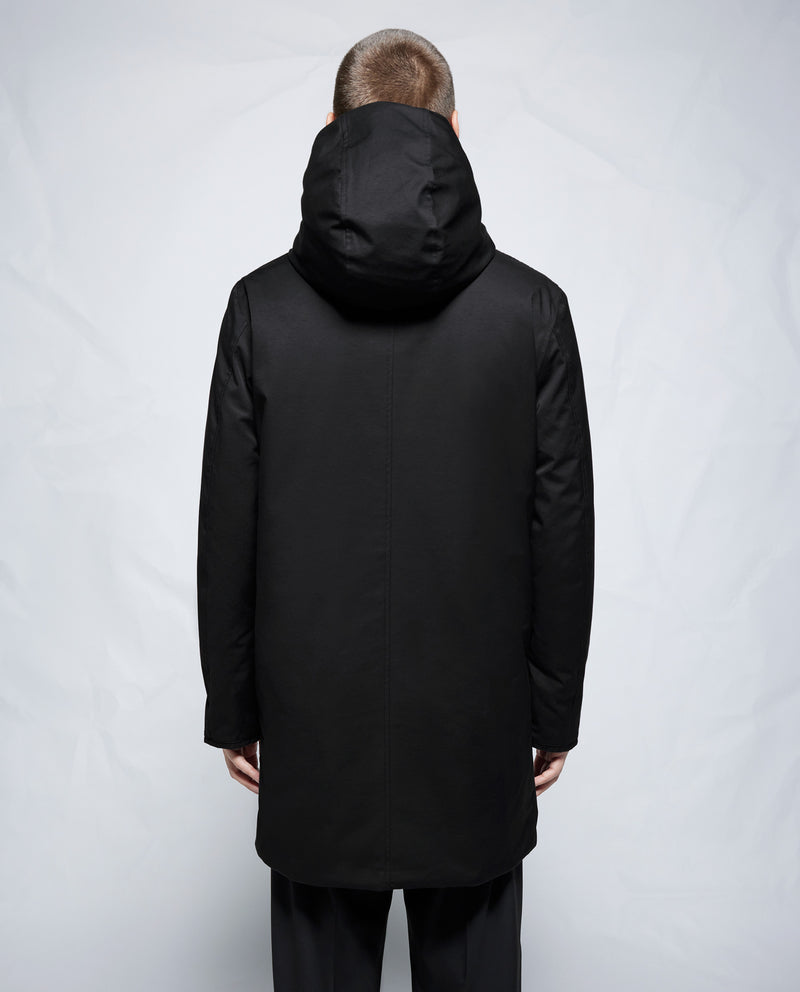 Diseño limpio en esta parka con capucha larga en tela mate.