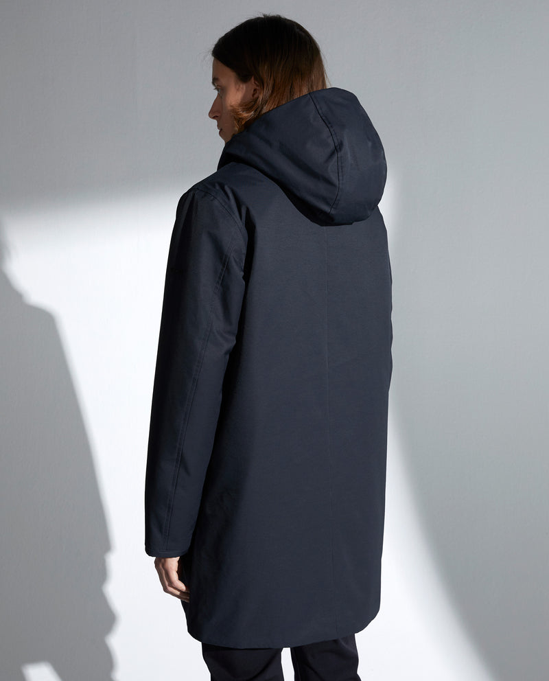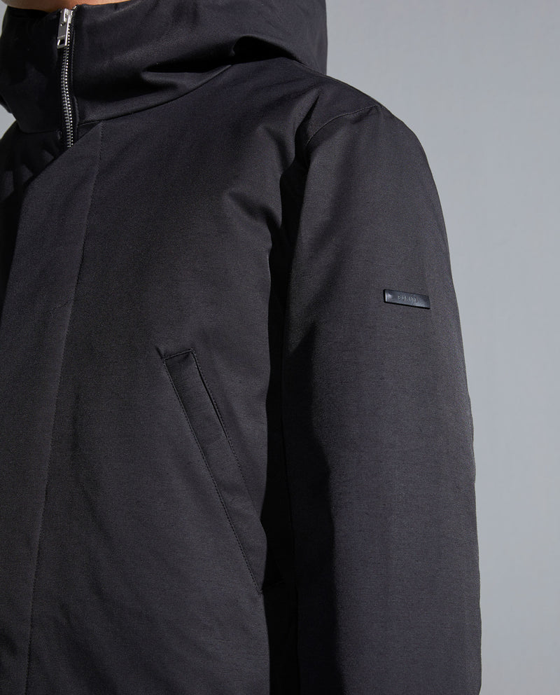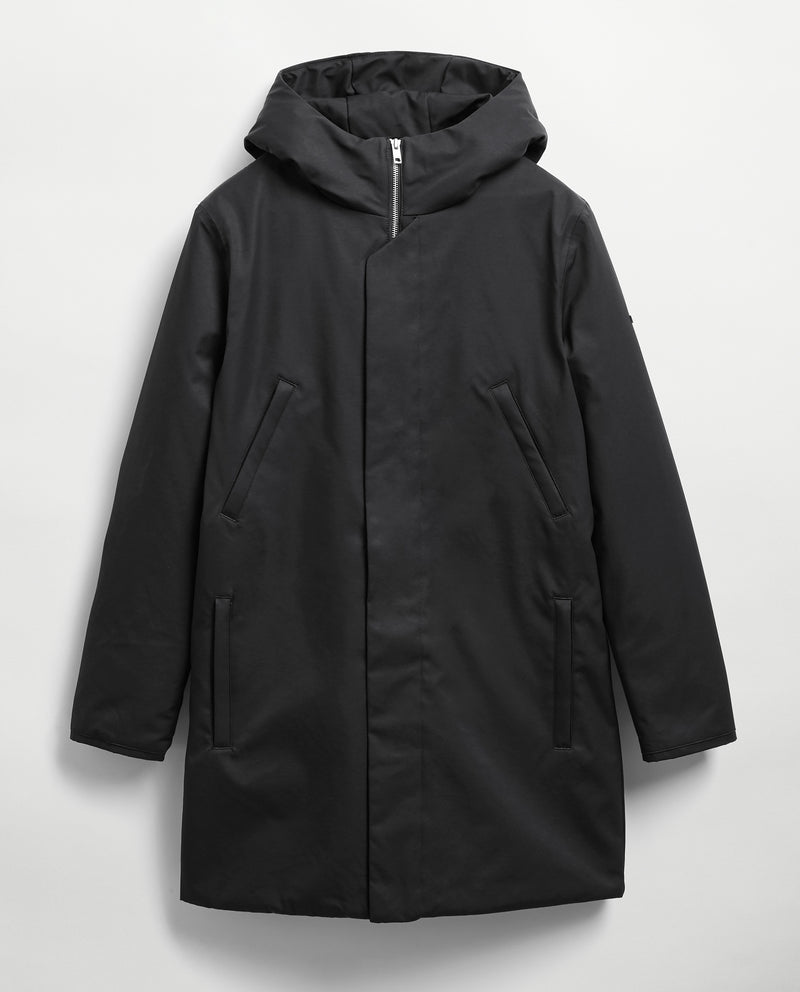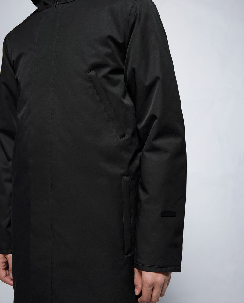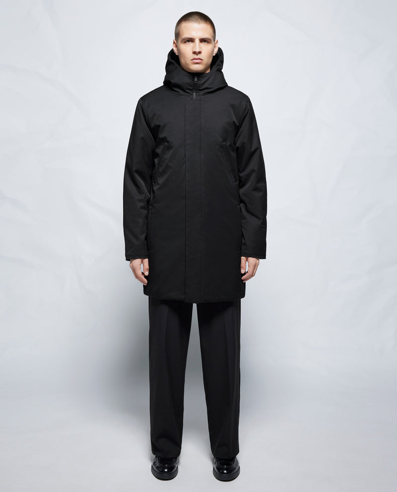 Diseño limpio en esta parka con capucha larga en tela mate.
