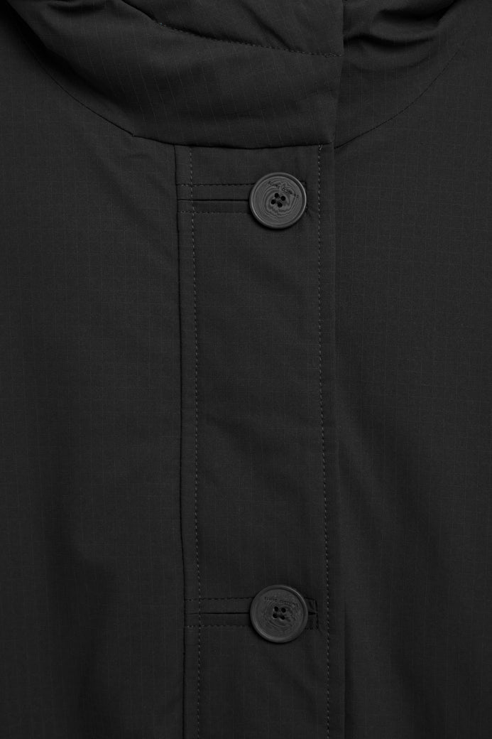 Confeccionada con tejido resistente al agua; debido a su confección, la prenda no es totalmente impermeable.