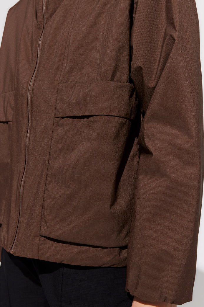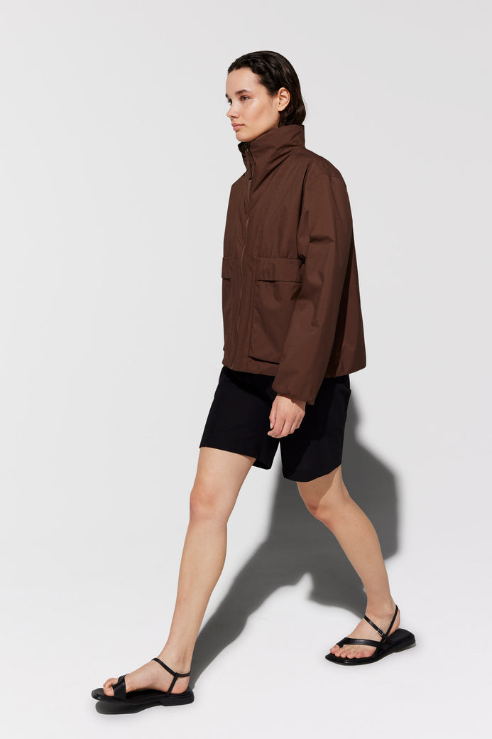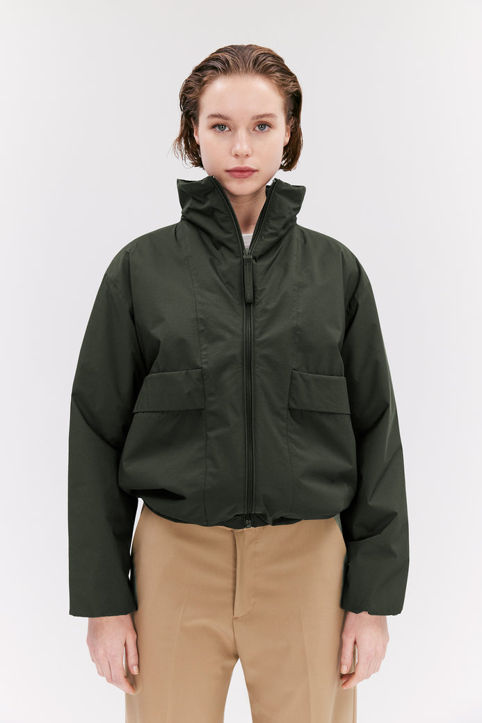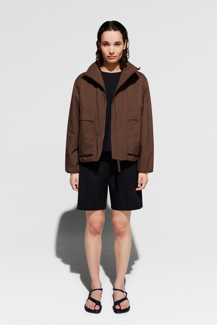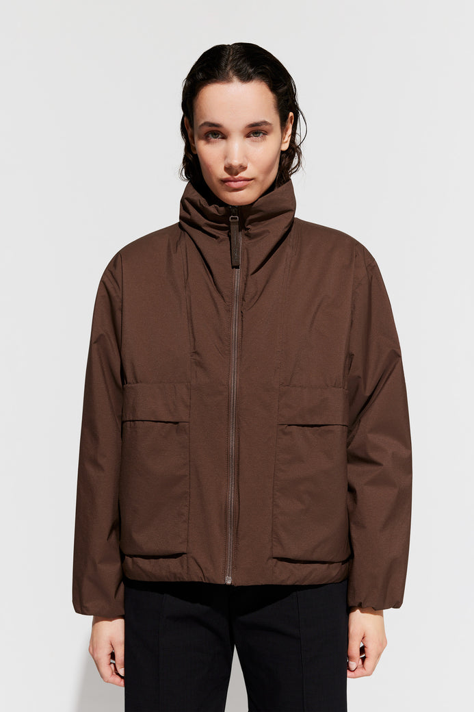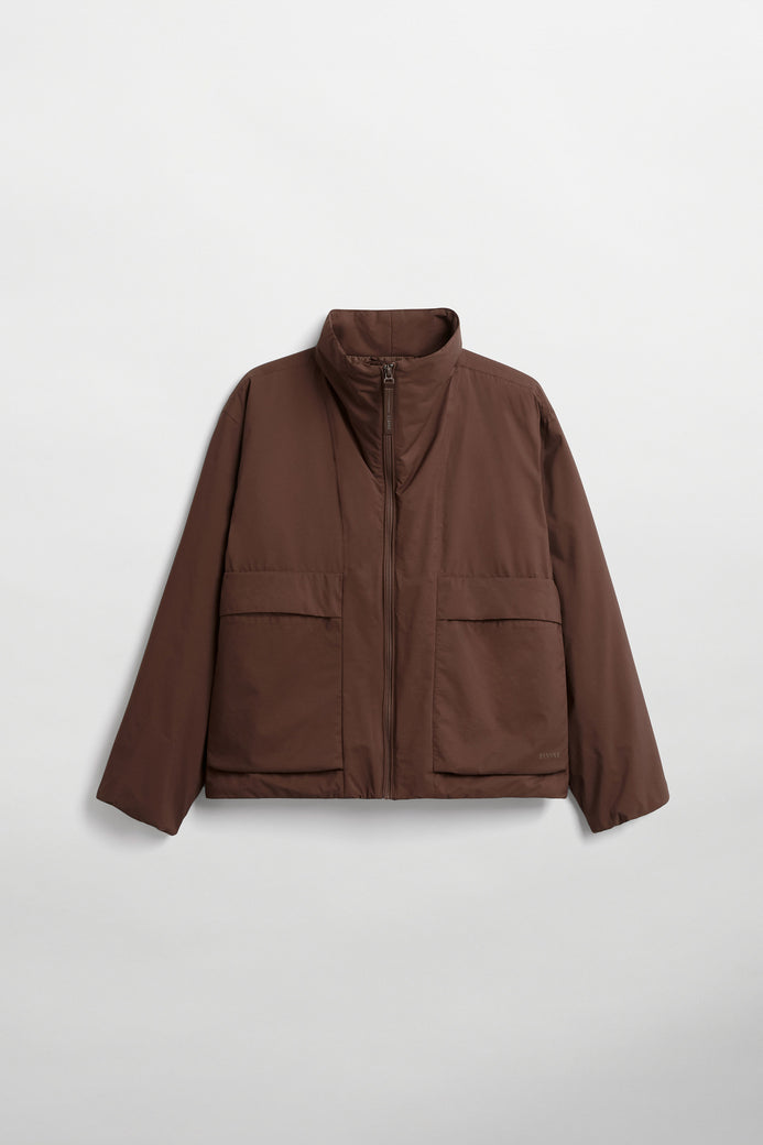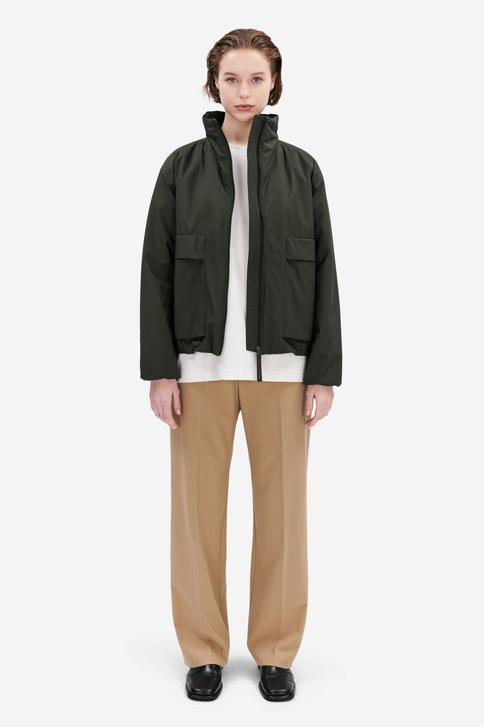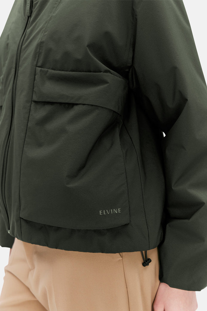 Mirja es una chaqueta ligeramente acolchada confeccionada con tejido Nylon Ripstop 5K. El material tiene una sensación nítida al tacto y propiedades impermeables, lo que te mantiene seco en los días lluviosos. Los detalles incluyen un diseño tipo bata en los puños para protegerte del viento, bolsillos con forro polar para mantener las manos calientes, dobladillo con cordón y cuello anorak. Use Mirja para lograr un look que combine deportividad con estilo.