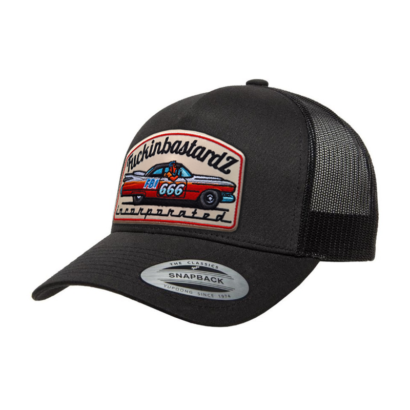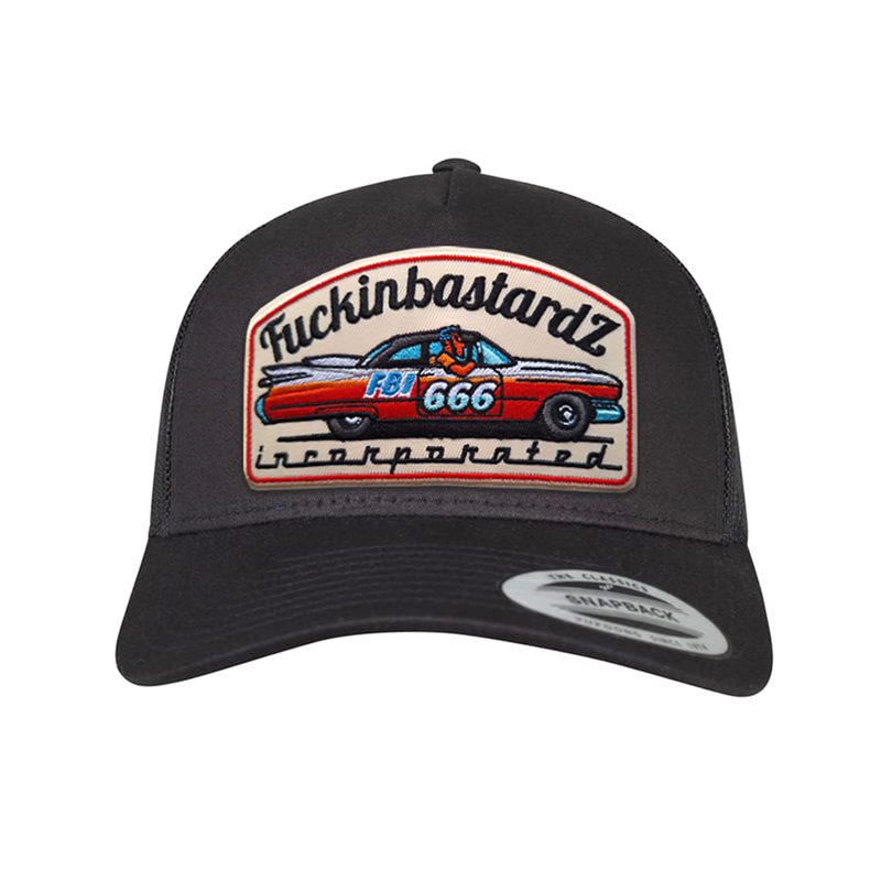 "NUEVA" Gorra trucker de la marca FBInc en color negro con un parche con letras en negro que dicen "Fuckin BASTARDZ Incorporated" y en el centro el "Cadillac DeVille".