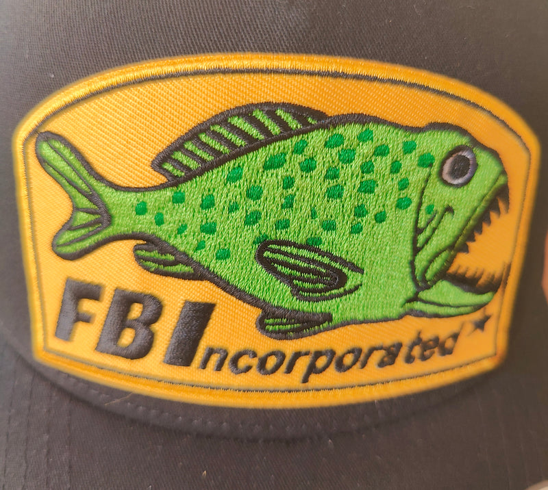 Gorra trucker de la marca FBInc en color negro con un parche amarillo con un pez verde y el nombre de la marca "FBincorporated". La parte trasera es toda de red para mejor transpiración y tiene una banda de plástico para poder regularla al tamaño deseado con broche.