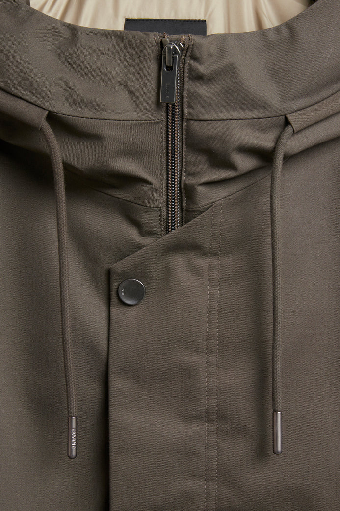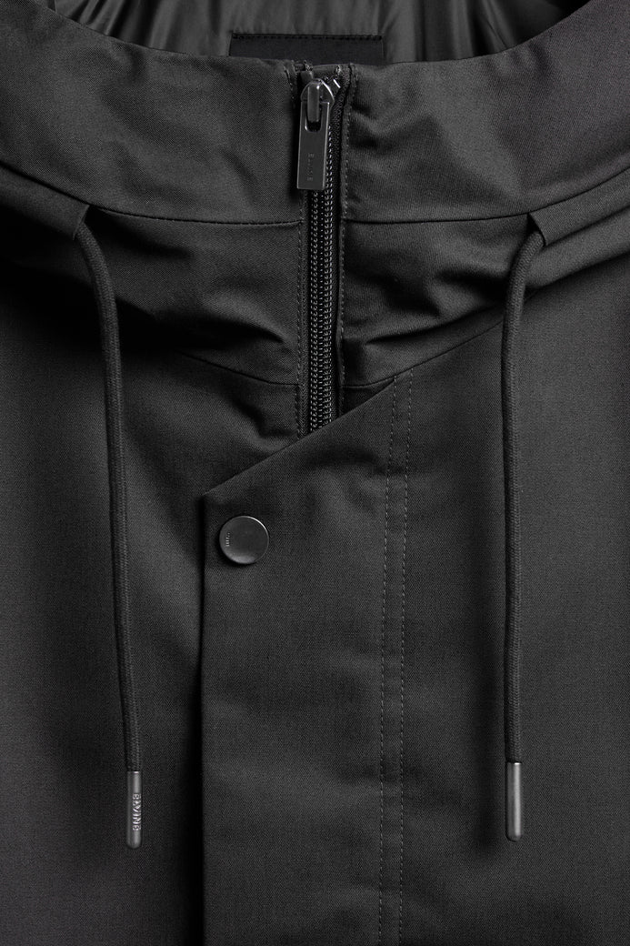 Confeccionada con tejido resistente al agua; debido a su confección, la prenda no es totalmente impermeable. Costuras resistentes en capucha, hombros y sisas selladas con cinta impermeable.