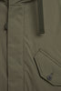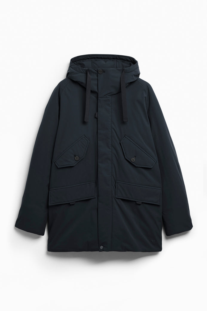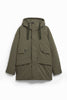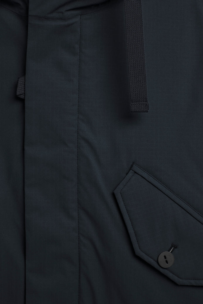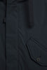 Confeccionada con tejido resistente al agua; debido a su confección, la prenda no es totalmente impermeable. Costuras resistentes en capucha, hombros y sisas selladas con cinta impermeable.