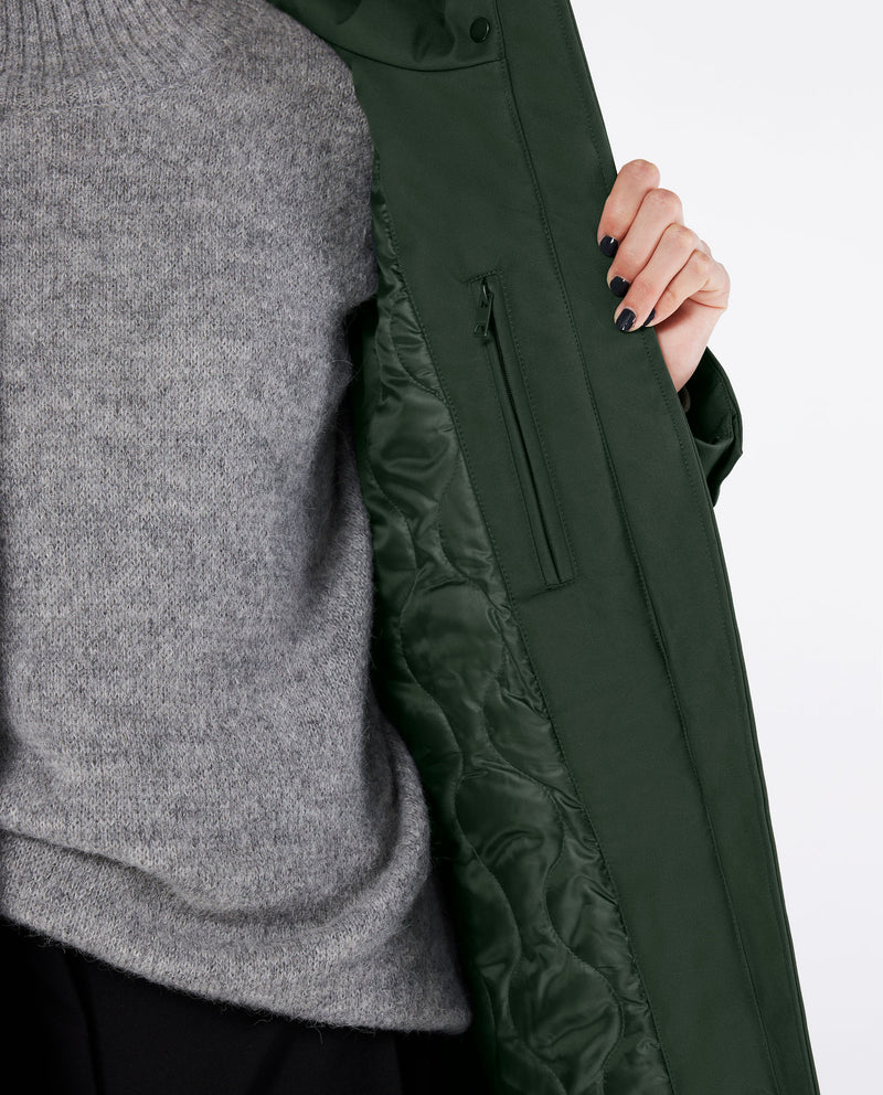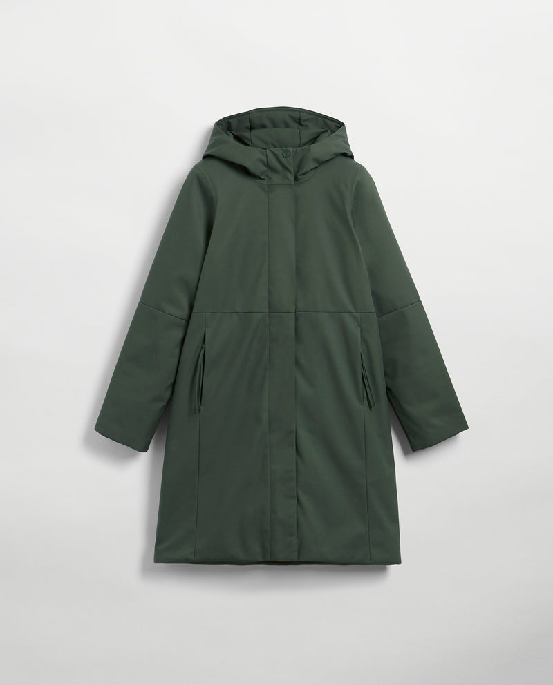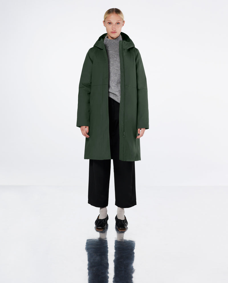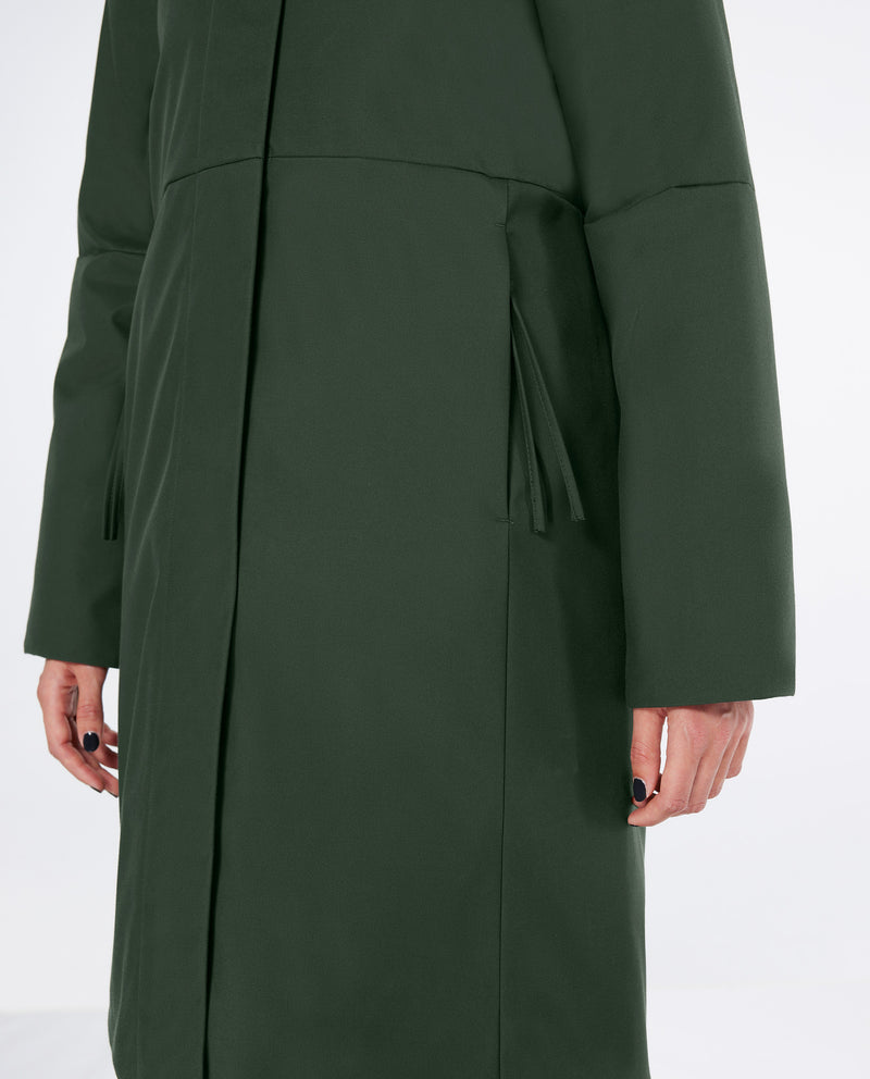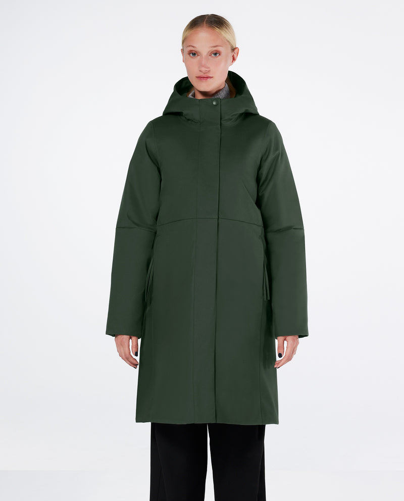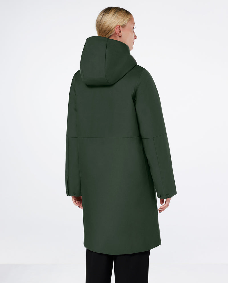 Elvira es una chaqueta larga en forma de A resistente al viento y repelente al agua.