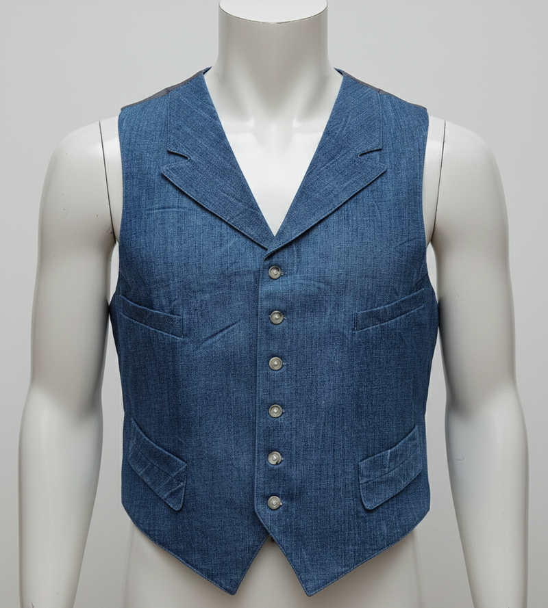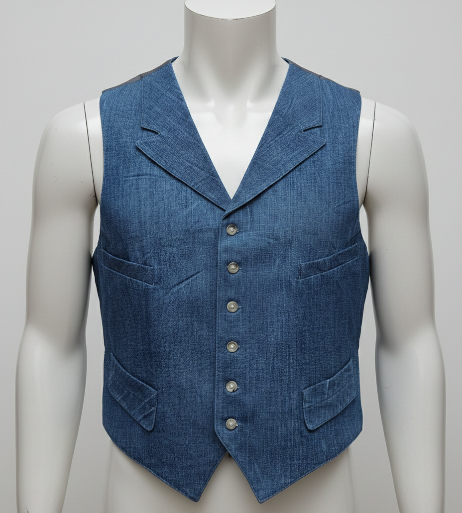 Este cómodo chaleco para hombre, confeccionado en denim reutilizado procedente de la decoración, lleva cuatro bolsillos delanteros, forro y espalda en seda 100% y botones de alta calidad. Fabricado a mano en España, es una pieza única exclusiva en talla Large.
