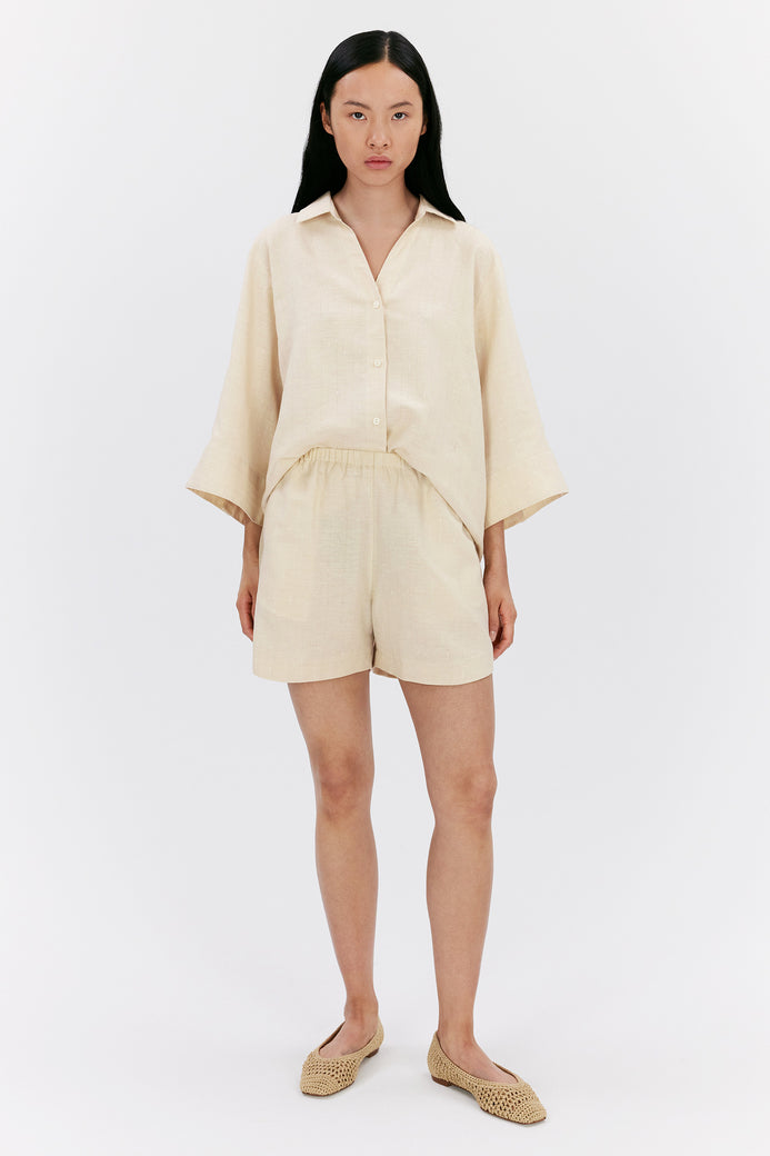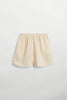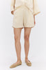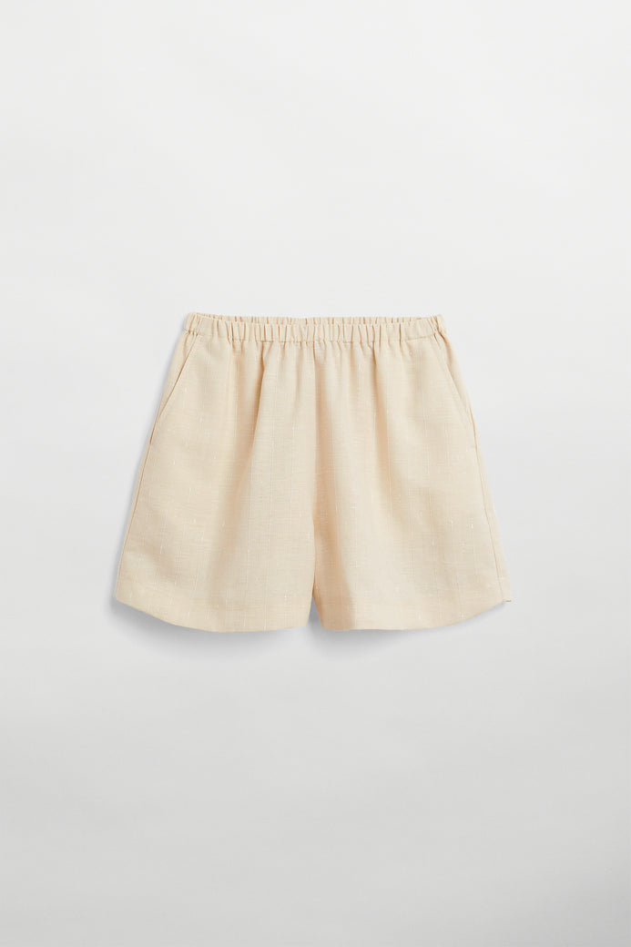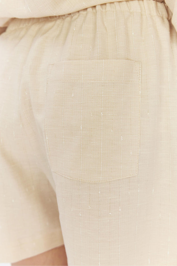 Alira es un pantalón corto confeccionado en tejido Slub Stripe. El material tiene una caída preciosa y un tacto suave, lo que lo hace increíblemente cómodo de llevar. Los detalles incluyen bolsillos laterales y un efecto flameado en los hilos, lo que le da a estos pantalones cortos un único aspecto y artesanal.